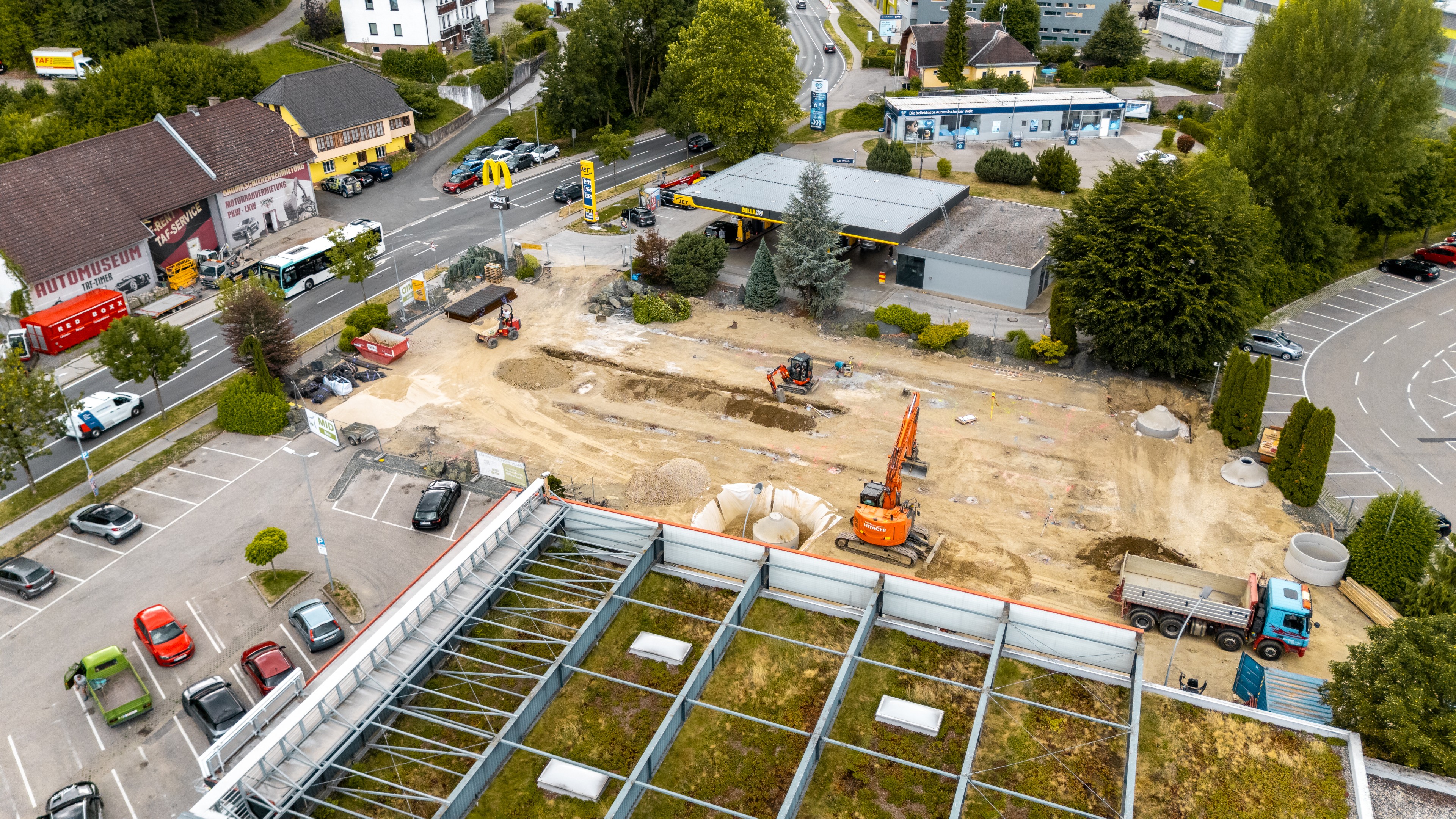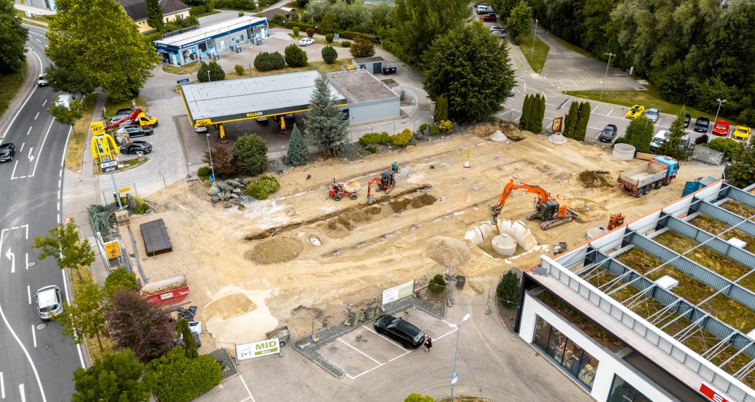 Die neue Filiale wird ebenfalls von der MID Bau GmbH nach modernen, nachhaltigen Standards errichtet – unter anderem mit einem begrünten Dach, einer Photovoltaikanlage und einer Luftwärmepumpe.